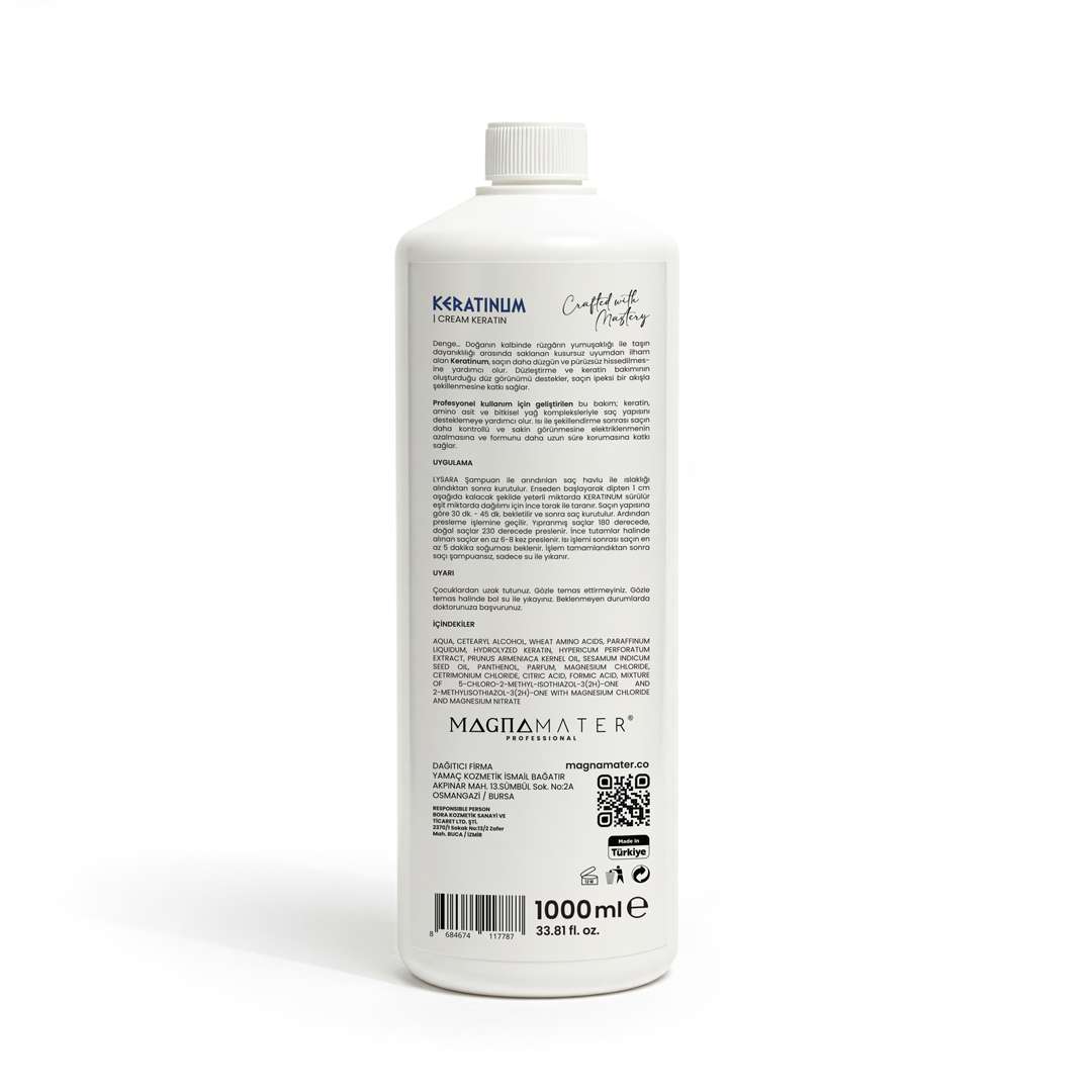 Kuaförler İçin Profesyonel Düzleştirme ve Bakım Ürünü – Krem Keratin Kuaför salonlarına özel Professional Seri. Keratinum Cream Keratin saçın daha düz, daha pürüzsüz hissedilmesine ve ipeksi akışla şekillenmesine yardımcı olan profesyonel düzleştirme odaklı keratin bakım kremidir. 1 numara Lysara Arındırıcı Şampuan ile arındırma sonrası uygulanır.